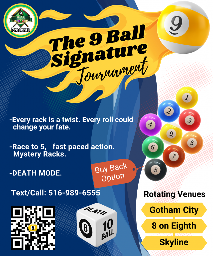 Weβre keeping the momentum going! The next 9-Ball Signature Tournament will be held at Gotham City Billiards on Friday, November 22.