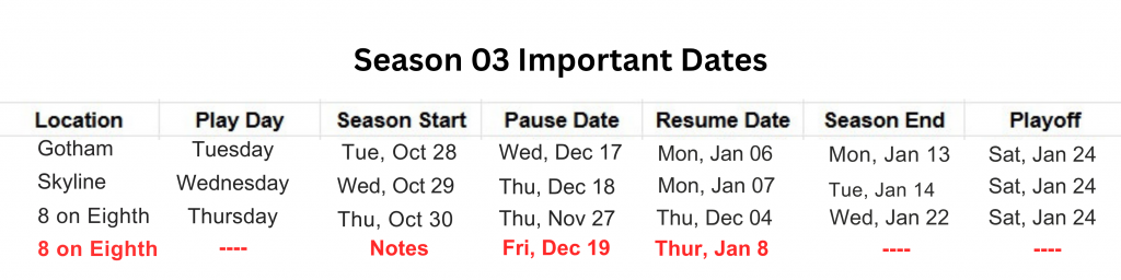 For players in the Thursday 8 on 8 division, just a quick reminder that we have league tonight. Looking forward to seeing you all at the tables!