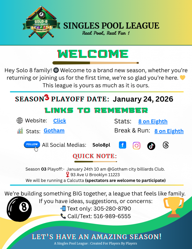 I want to sincerely apologize for the delay in the updating of league info. We’ve been working tirelessly behind the scenes to revamp Solo 8 Pool League website, and I’m happy to say it’s now at a point where everything is in one place for you.